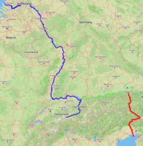 Na lang en kort beraad is het duidelijk, het waarnaartoe en wanneer. Ik zal samen met Frans vanuit Gennep vertrekken naar Kalkar en daar ergens in de buurt de Eurovelo 15 Rijnroute oppakken. Eurovelo 15 Rhineroute Deze is ongeveer 1460km met 7791hm maar deze rijden we niet helemaal uit (1100km) maar bij Bregenz slaan we linksaf naar Lindau en zullen we switchen naar de Beierse Alpen route. beierse-alpen route Deze route is een dikke 400km met ruim 5000hm en gaat over de Alpen en deze zullen we volgen naar Salzburg alwaar we weer switchen van route, namelijk de Alpe Adria radweg Alpe Adria radweg naar Grado Italie deze route is 421 km met 3927hm. Vanuit daar zullen we freewheelen terug naar München waar we de ICE trein zullen pakken naar NL. Onderweg word er gekampeerd en, gelogeerd en gehotelleerd En wanneer is de start van al dat plezier hoor ik je denken. Nou die is als het goed is in de week van 12 Mei 2026. We denken hier zo’n dikke 3 weken mee bezig te zijn maar dat is niet in beton gegoten.De tocht is ongeveer totaal geloof ik 2700 ish km. Hopelijk zijn de weergoden ons gunstig gezind want dat weet je maar nooit half mei. Dus tot die tijd zal ik er nog even aan moeten trekken mede omdat ik de laatste tijd niet veel heb gefietst. We zullen onderweg weer veel vastleggen, hetzij film of foto’s en ik zal proberen er hier (of op Bike010) dagelijks een post aan te spenderen. Tot die tijd is het nog even afwachten en thee drinken. Maar feit is dat ik er heel veel zin in heb. Zo nu verder met uitzoeken wat ik teveel ga meenemen.